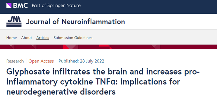 [1] Winstone JK, Pathak KV, Winslow W, et al. Glyphosate infiltrates the brain and increases pro-inflammatory cytokine TNFα: implications for neurodegenerative disorders. J Neuroinflammation. 2022 Jul 28;19(1):193. doi: 10.1186/s12974-022-02544-5. PMID: 35897073; PMCID: PMC9331154.